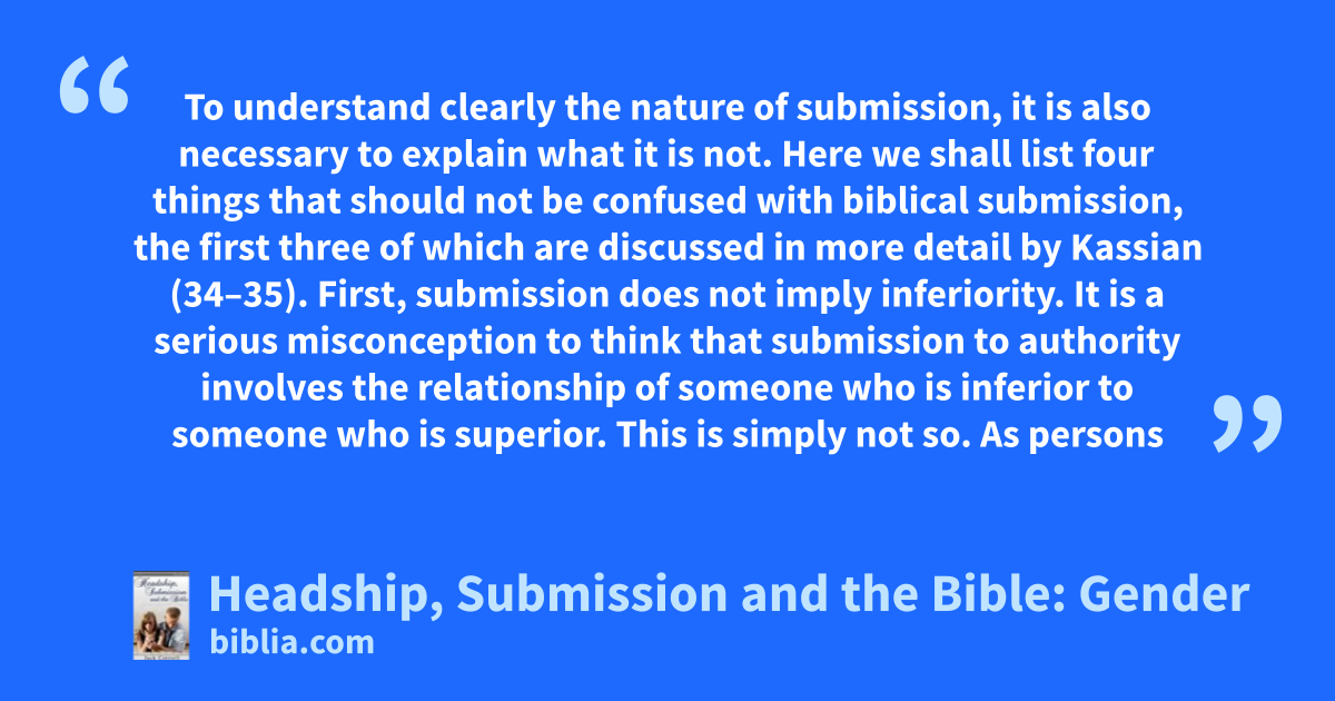 To understand clearly the nature of submission, it is also necessary to explain what it is not. Here we shall list four things that should not be confused with biblical submission, the first three of which are discussed in more detail by Kassian (34–35). First, submission does not imply inferiority. It is a serious misconception to think that submission to authority involves the relationship of someone who is inferior to someone who is superior. This is simply not so. As persons