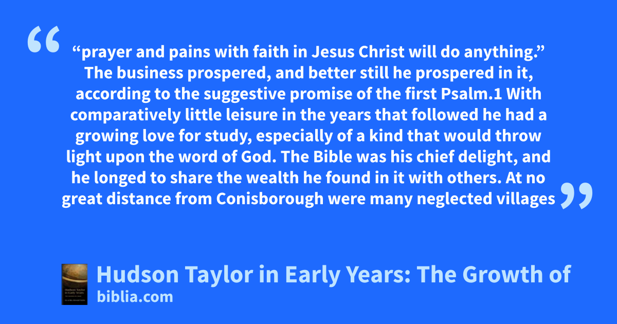 “prayer and pains with faith in Jesus Christ will do anything.” The business prospered, and better still he prospered in it, according to the suggestive promise of the first Psalm.1 With comparatively little leisure in the years that followed he had a growing love for study, especially of a kind that would throw light upon the word of God. The Bible was his chief delight, and he longed to share the wealth he found in it with others. At no great distance from Conisborough were many neglected villages