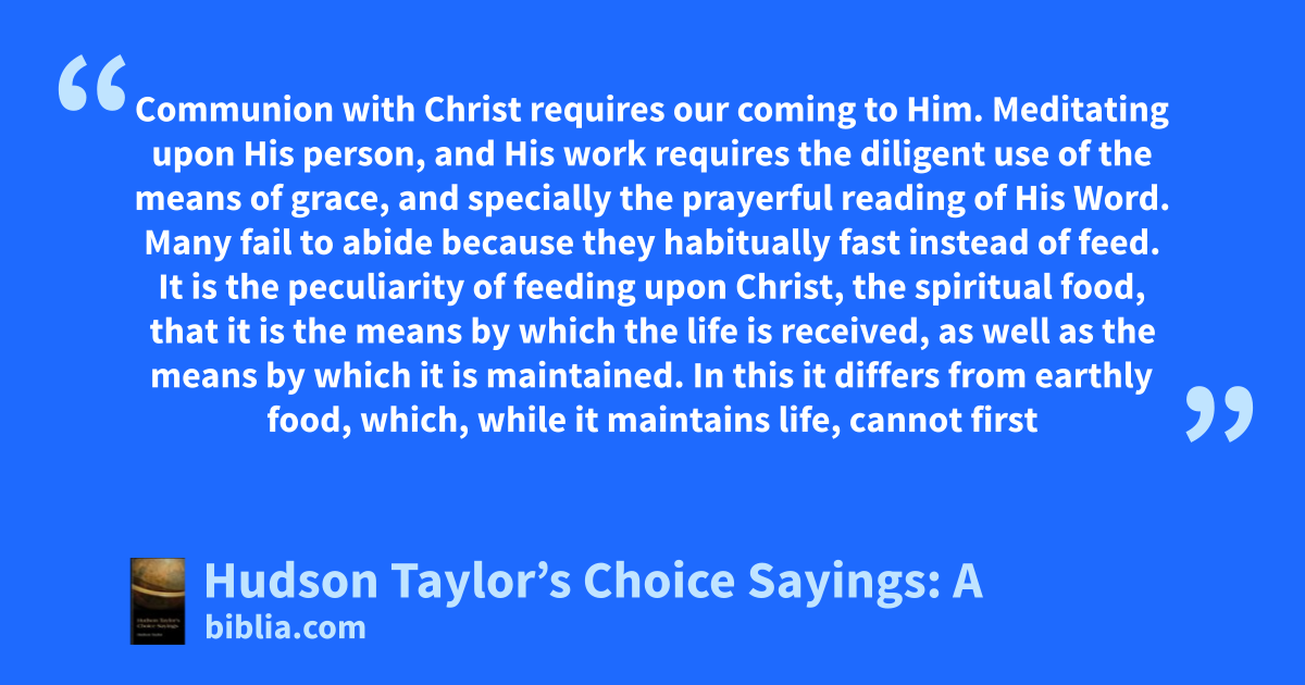 Communion with Christ requires our coming to Him. Meditating upon His person, and His work requires the diligent use of the means of grace, and specially the prayerful reading of His Word. Many fail to abide because they habitually fast instead of feed. It is the peculiarity of feeding upon Christ, the spiritual food, that it is the means by which the life is received, as well as the means by which it is maintained. In this it differs from earthly food, which, while it maintains life, cannot first
