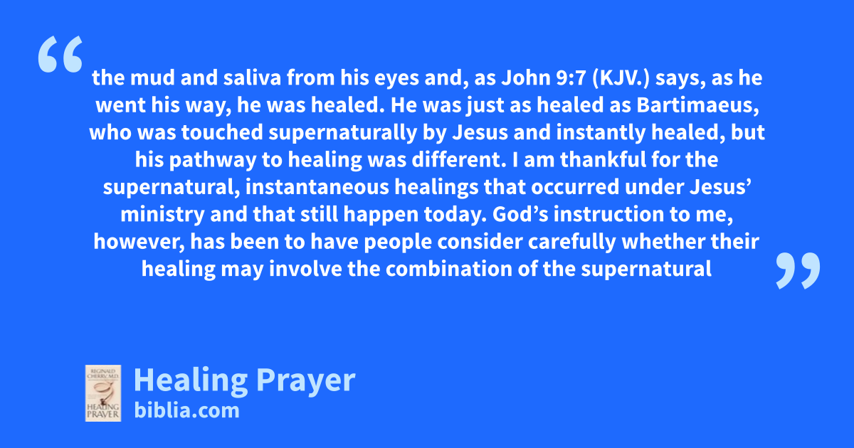 the mud and saliva from his eyes and, as John 9:7 (KJV.) says, as he went his way, he was healed. He was just as healed as Bartimaeus, who was touched supernaturally by Jesus and instantly healed, but his pathway to healing was different. I am thankful for the supernatural, instantaneous healings that occurred under Jesus’ ministry and that still happen today. God’s instruction to me, however, has been to have people consider carefully whether their healing may involve the combination of the supernatural