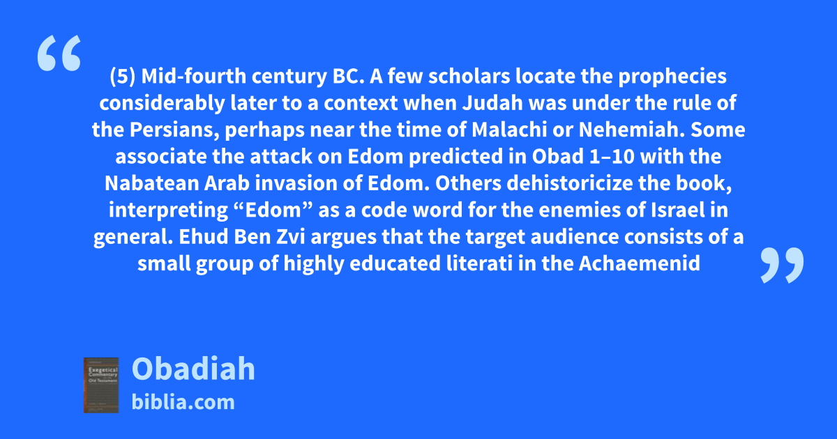(5) Mid-fourth century BC. A few scholars locate the prophecies considerably later to a context when Judah was under the rule of the Persians, perhaps near the time of Malachi or Nehemiah. Some associate the attack on Edom predicted in Obad 1–10 with the Nabatean Arab invasion of Edom. Others dehistoricize the book, interpreting “Edom” as a code word for the enemies of Israel in general. Ehud Ben Zvi argues that the target audience consists of a small group of highly educated literati in the Achaemenid