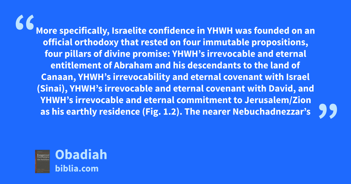 More specifically, Israelite confidence in YHWH was founded on an official orthodoxy that rested on four immutable propositions, four pillars of divine promise: YHWH’s irrevocable and eternal entitlement of Abraham and his descendants to the land of Canaan, YHWH’s irrevocability and eternal covenant with Israel (Sinai), YHWH’s irrevocable and eternal covenant with David, and YHWH’s irrevocable and eternal commitment to Jerusalem/Zion as his earthly residence (Fig. 1.2). The nearer Nebuchadnezzar’s