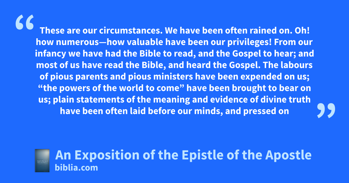 These are our circumstances. We have been often rained on. Oh! how numerous—how valuable have been our privileges! From our infancy we have had the Bible to read, and the Gospel to hear; and most of us have read the Bible, and heard the Gospel. The labours of pious parents and pious ministers have been expended on us; “the powers of the world to come” have been brought to bear on us; plain statements of the meaning and evidence of divine truth have been often laid before our minds, and pressed on