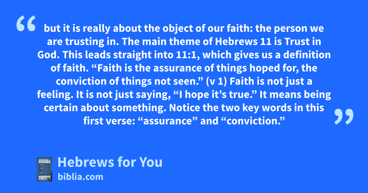 but it is really about the object of our faith: the person we are trusting in. The main theme of Hebrews 11 is Trust in God. This leads straight into 11:1, which gives us a definition of faith. “Faith is the assurance of things hoped for, the conviction of things not seen.” (v 1) Faith is not just a feeling. It is not just saying, “I hope it’s true.” It means being certain about something. Notice the two key words in this first verse: “assurance” and “conviction.”