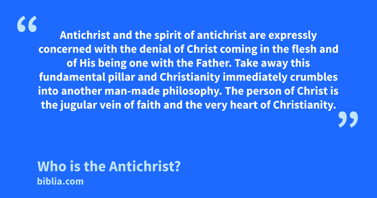Antichrist and the spirit of antichrist are expressly concerned with the denial of Christ coming in the flesh and of His being one with the Father. Take away this fundamental pillar and Christianity immediately crumbles into another man-made philosophy. The person of Christ is the jugular vein of faith and the very heart of Christianity.
