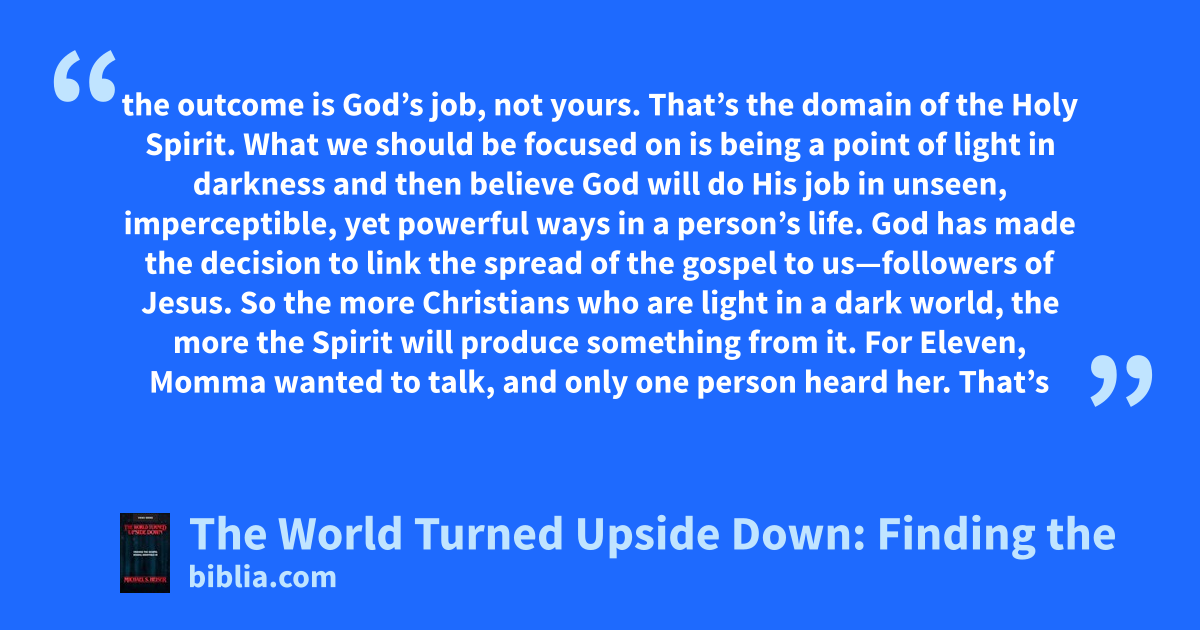 the outcome is God’s job, not yours. That’s the domain of the Holy Spirit. What we should be focused on is being a point of light in darkness and then believe God will do His job in unseen, imperceptible, yet powerful ways in a person’s life. God has made the decision to link the spread of the gospel to us—followers of Jesus. So the more Christians who are light in a dark world, the more the Spirit will produce something from it. For Eleven, Momma wanted to talk, and only one person heard her. That’s