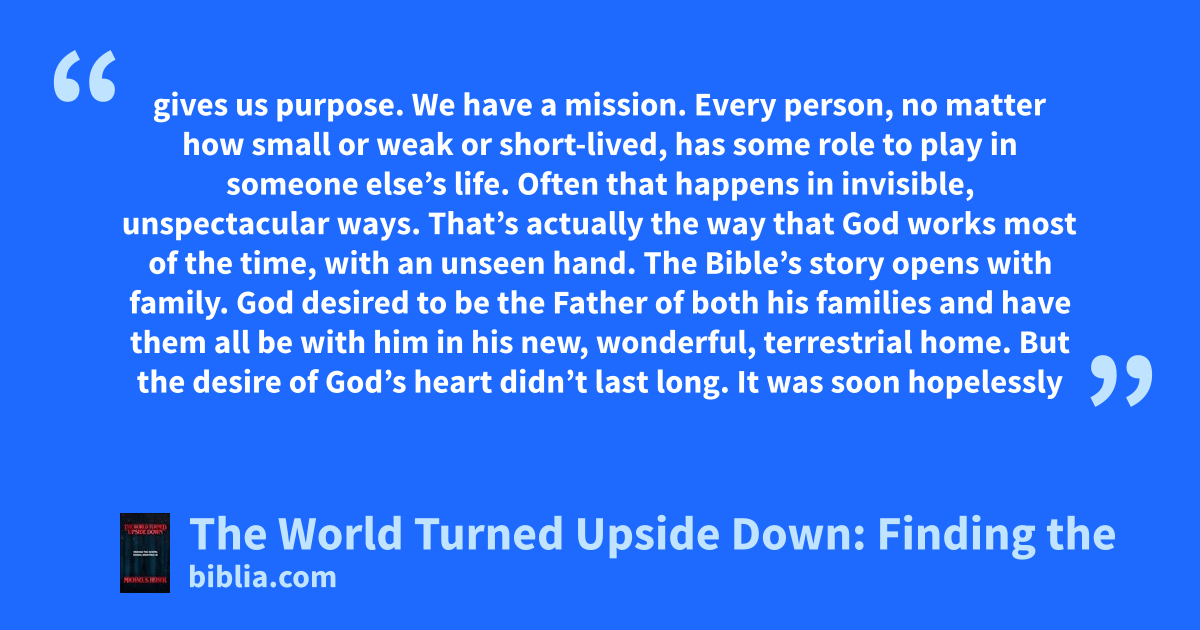 gives us purpose. We have a mission. Every person, no matter how small or weak or short-lived, has some role to play in someone else’s life. Often that happens in invisible, unspectacular ways. That’s actually the way that God works most of the time, with an unseen hand. The Bible’s story opens with family. God desired to be the Father of both his families and have them all be with him in his new, wonderful, terrestrial home. But the desire of God’s heart didn’t last long. It was soon hopelessly