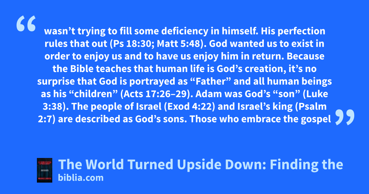 wasn’t trying to fill some deficiency in himself. His perfection rules that out (Ps 18:30; Matt 5:48). God wanted us to exist in order to enjoy us and to have us enjoy him in return. Because the Bible teaches that human life is God’s creation, it’s no surprise that God is portrayed as “Father” and all human beings as his “children” (Acts 17:26–29). Adam was God’s “son” (Luke 3:38). The people of Israel (Exod 4:22) and Israel’s king (Psalm 2:7) are described as God’s sons. Those who embrace the gospel