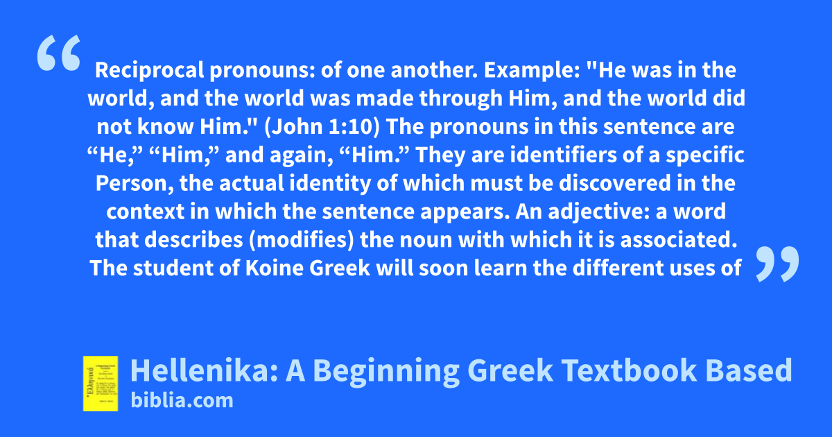 Reciprocal pronouns: of one another. Example: "He was in the world, and the world was made through Him, and the world did not know Him." (John 1:10) The pronouns in this sentence are “He,” “Him,” and again, “Him.” They are identifiers of a specific Person, the actual identity of which must be discovered in the context in which the sentence appears. An adjective: a word that describes (modifies) the noun with which it is associated. The student of Koine Greek will soon learn the different uses of