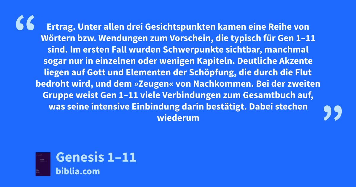 Ertrag. Unter allen drei Gesichtspunkten kamen eine Reihe von Wörtern bzw. Wendungen zum Vorschein, die typisch für Gen 1–11 sind. Im ersten Fall wurden Schwerpunkte sichtbar, manchmal sogar nur in einzelnen oder wenigen Kapiteln. Deutliche Akzente liegen auf Gott und Elementen der Schöpfung, die durch die Flut bedroht wird, und dem »Zeugen« von Nachkommen. Bei der zweiten Gruppe weist Gen 1–11 viele Verbindungen zum Gesamtbuch auf, was seine intensive Einbindung darin bestätigt. Dabei stechen wiederum
