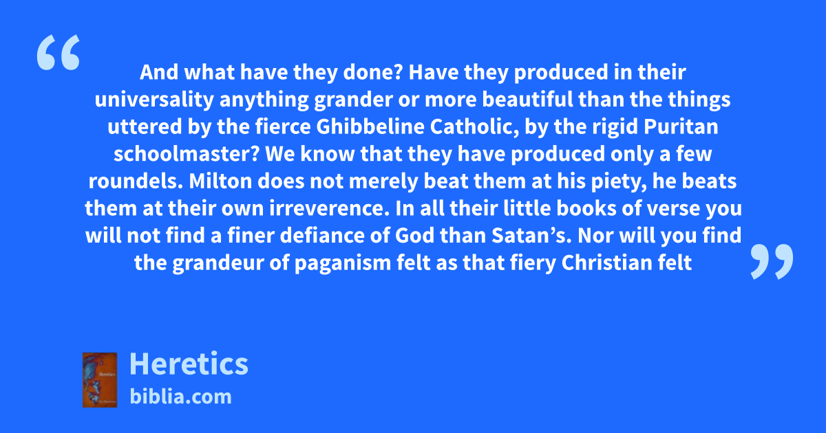 And what have they done? Have they produced in their universality anything grander or more beautiful than the things uttered by the fierce Ghibbeline Catholic, by the rigid Puritan schoolmaster? We know that they have produced only a few roundels. Milton does not merely beat them at his piety, he beats them at their own irreverence. In all their little books of verse you will not find a finer defiance of God than Satan’s. Nor will you find the grandeur of paganism felt as that fiery Christian felt
