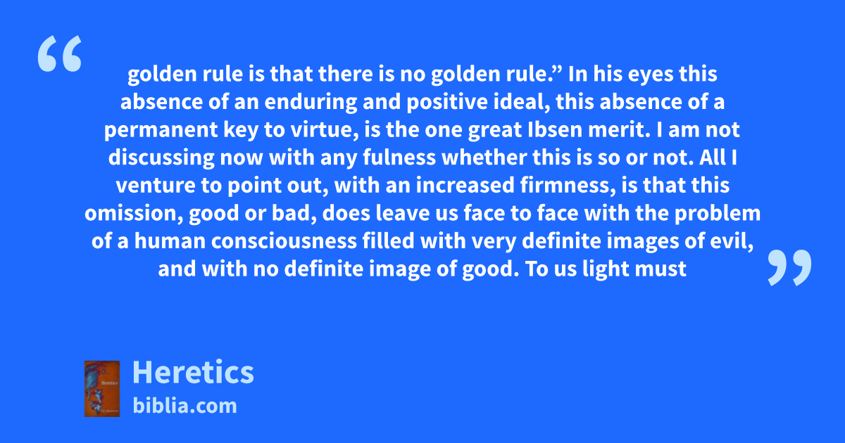 golden rule is that there is no golden rule.” In his eyes this absence of an enduring and positive ideal, this absence of a permanent key to virtue, is the one great Ibsen merit. I am not discussing now with any fulness whether this is so or not. All I venture to point out, with an increased firmness, is that this omission, good or bad, does leave us face to face with the problem of a human consciousness filled with very definite images of evil, and with no definite image of good. To us light must