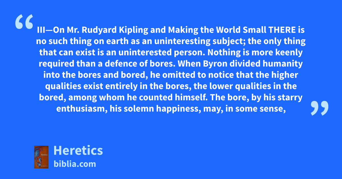 Heretics exposes the heresy of modern intellectual trends and discredits their proponents. Chesterton confronts relativism, individualism, neo-paganism, and the other ailments contributing to the decline of Western thought in the modern era. He pays special attention to artists and the literati, and writes in detail about current events which are shaped by the social consciousness of his time....