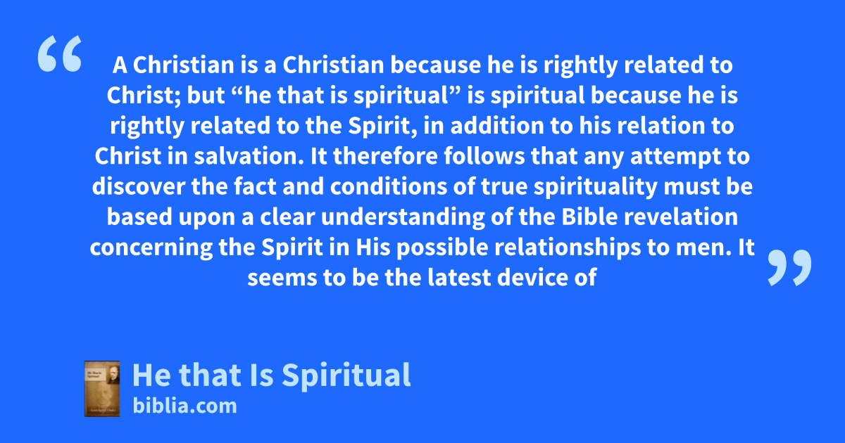 A Christian is a Christian because he is rightly related to Christ; but “he that is spiritual” is spiritual because he is rightly related to the Spirit, in addition to his relation to Christ in salvation. It therefore follows that any attempt to discover the fact and conditions of true spirituality must be based upon a clear understanding of the Bible revelation concerning the Spirit in His possible relationships to men. It seems to be the latest device of