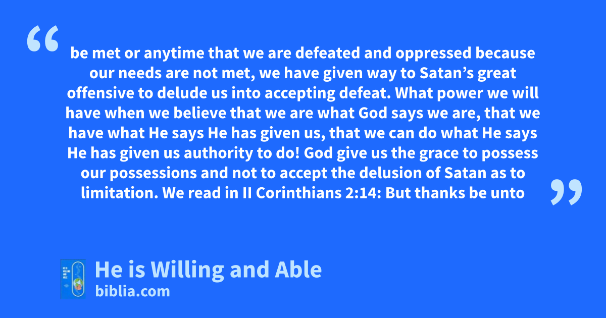 be met or anytime that we are defeated and oppressed because our needs are not met, we have given way to Satan’s great offensive to delude us into accepting defeat. What power we will have when we believe that we are what God says we are, that we have what He says He has given us, that we can do what He says He has given us authority to do! God give us the grace to possess our possessions and not to accept the delusion of Satan as to limitation. We read in II Corinthians 2:14: But thanks be unto