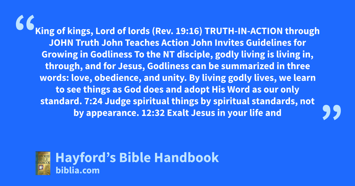 King of kings, Lord of lords (Rev. 19:16) TRUTH-IN-ACTION through JOHN Truth John Teaches Action John Invites Guidelines for Growing in Godliness To the NT disciple, godly living is living in, through, and for Jesus, Godliness can be summarized in three words: love, obedience, and unity. By living godly lives, we learn to see things as God does and adopt His Word as our only standard. 7:24 Judge spiritual things by spiritual standards, not by appearance. 12:32 Exalt Jesus in your life and