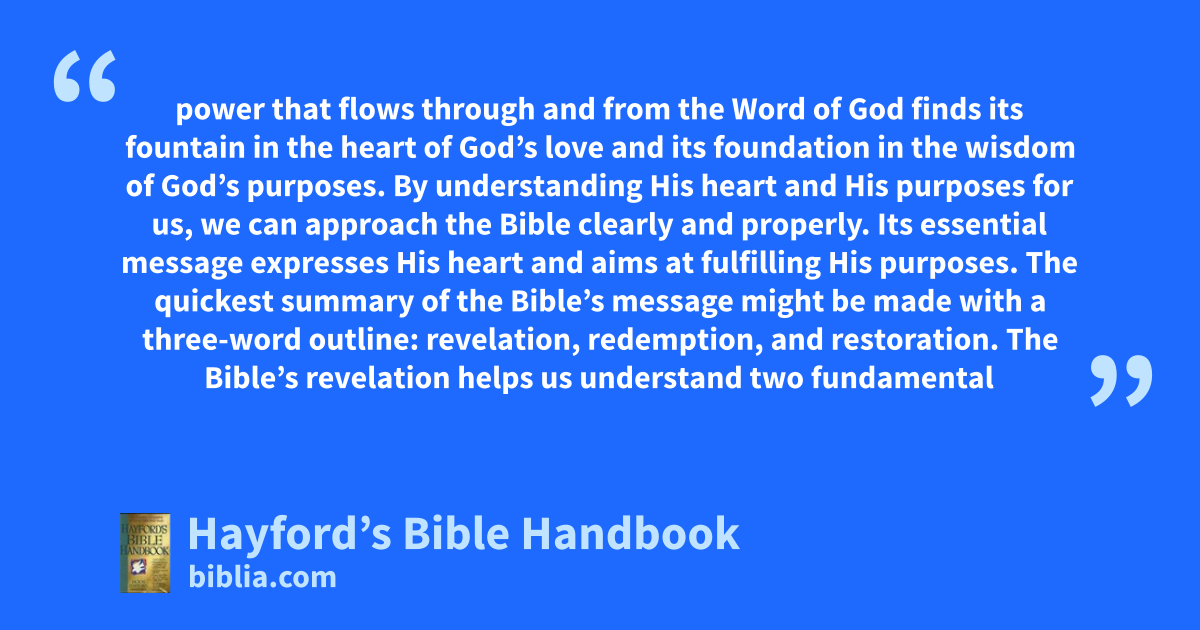 power that flows through and from the Word of God finds its fountain in the heart of God’s love and its foundation in the wisdom of God’s purposes. By understanding His heart and His purposes for us, we can approach the Bible clearly and properly. Its essential message expresses His heart and aims at fulfilling His purposes. The quickest summary of the Bible’s message might be made with a three-word outline: revelation, redemption, and restoration. The Bible’s revelation helps us understand two fundamental