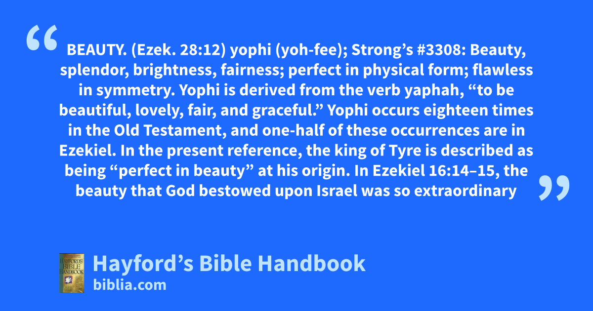 BEAUTY. (Ezek. 28:12) yophi (yoh-fee); Strong’s #3308: Beauty, splendor, brightness, fairness; perfect in physical form; flawless in symmetry. Yophi is derived from the verb yaphah, “to be beautiful, lovely, fair, and graceful.” Yophi occurs eighteen times in the Old Testament, and one-half of these occurrences are in Ezekiel. In the present reference, the king of Tyre is described as being “perfect in beauty” at his origin. In Ezekiel 16:14–15, the beauty that God bestowed upon Israel was so extraordinary