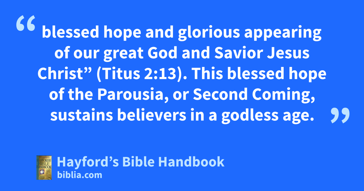 blessed hope and glorious appearing of our great God and Savior Jesus Christ” (Titus 2:13). This blessed hope of the Parousia, or Second Coming, sustains believers in a godless age.