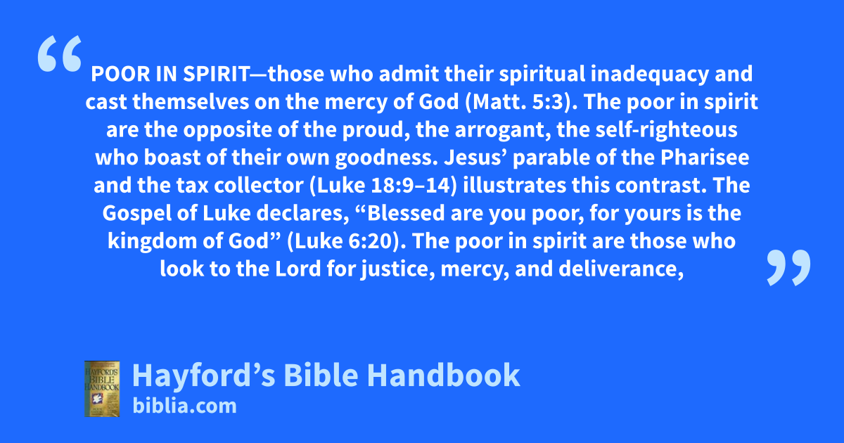 POOR IN SPIRIT—those who admit their spiritual inadequacy and cast themselves on the mercy of God (Matt. 5:3). The poor in spirit are the opposite of the proud, the arrogant, the self-righteous who boast of their own goodness. Jesus’ parable of the Pharisee and the tax collector (Luke 18:9–14) illustrates this contrast. The Gospel of Luke declares, “Blessed are you poor, for yours is the kingdom of God” (Luke 6:20). The poor in spirit are those who look to the Lord for justice, mercy, and deliverance,