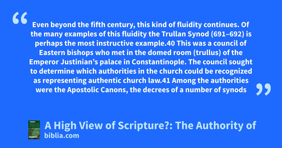 Even beyond the fifth century, this kind of fluidity continues. Of the many examples of this fluidity the Trullan Synod (691–692) is perhaps the most instructive example.40 This was a council of Eastern bishops who met in the domed room (trullus) of the Emperor Justinian’s palace in Constantinople. The council sought to determine which authorities in the church could be recognized as representing authentic church law.41 Among the authorities were the Apostolic Canons, the decrees of a number of synods