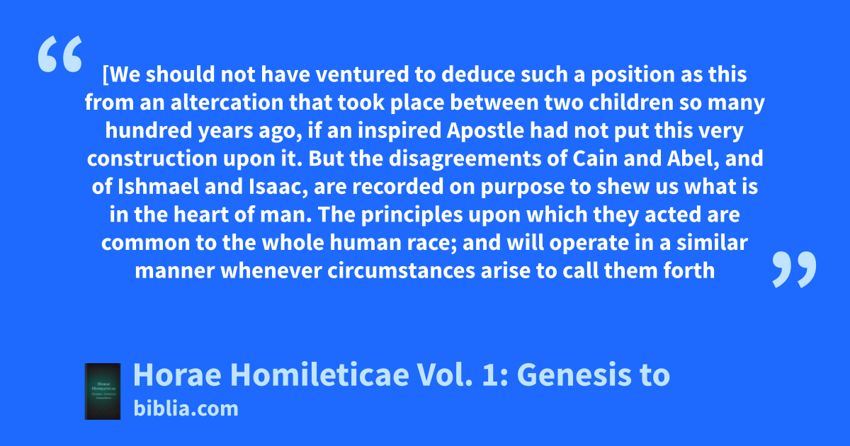 [We should not have ventured to deduce such a position as this from an altercation that took place between two children so many hundred years ago, if an inspired Apostle had not put this very construction upon it. But the disagreements of Cain and Abel, and of Ishmael and Isaac, are recorded on purpose to shew us what is in the heart of man. The principles upon which they acted are common to the whole human race; and will operate in a similar manner whenever circumstances arise to call them forth