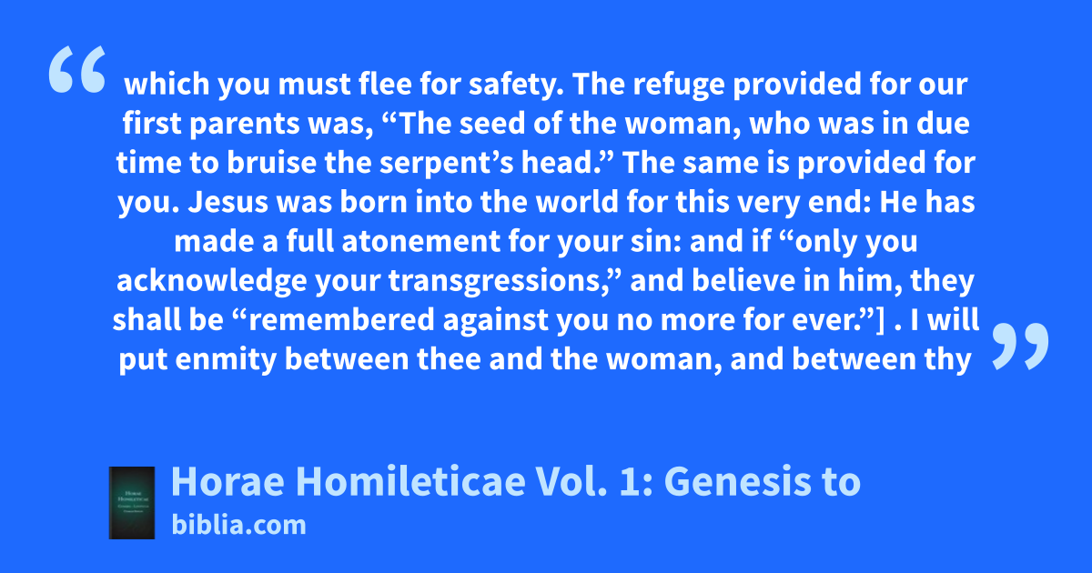 which you must flee for safety. The refuge provided for our first parents was, “The seed of the woman, who was in due time to bruise the serpent’s head.” The same is provided for you. Jesus was born into the world for this very end: He has made a full atonement for your sin: and if “only you acknowledge your transgressions,” and believe in him, they shall be “remembered against you no more for ever.”] . I will put enmity between thee and the woman, and between thy
