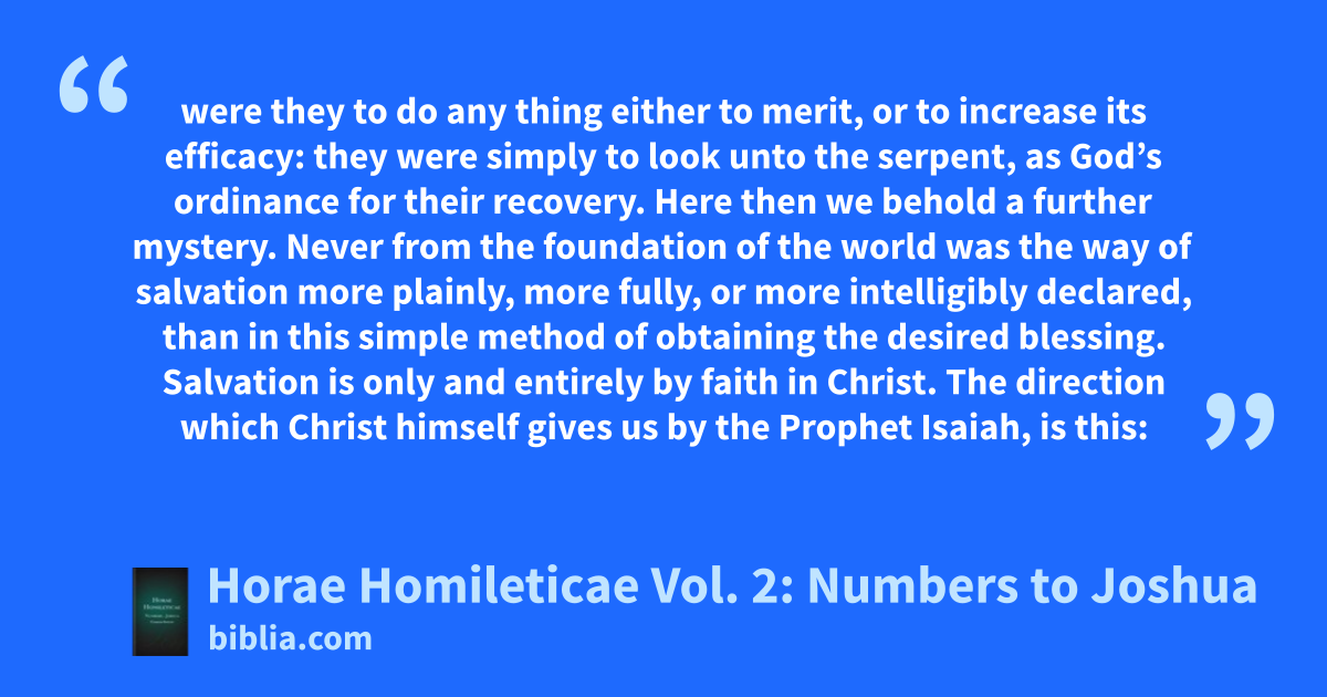 were they to do any thing either to merit, or to increase its efficacy: they were simply to look unto the serpent, as God’s ordinance for their recovery. Here then we behold a further mystery. Never from the foundation of the world was the way of salvation more plainly, more fully, or more intelligibly declared, than in this simple method of obtaining the desired blessing. Salvation is only and entirely by faith in Christ. The direction which Christ himself gives us by the Prophet Isaiah, is this: