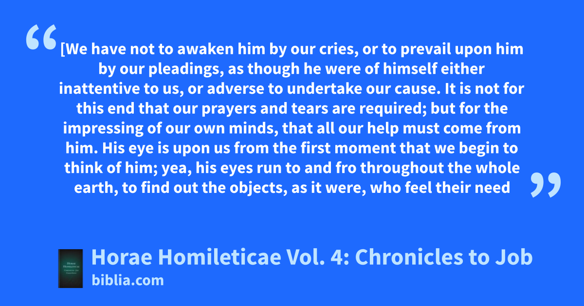 [We have not to awaken him by our cries, or to prevail upon him by our pleadings, as though he were of himself either inattentive to us, or adverse to undertake our cause. It is not for this end that our prayers and tears are required; but for the impressing of our own minds, that all our help must come from him. His eye is upon us from the first moment that we begin to think of him; yea, his eyes run to and fro throughout the whole earth, to find out the objects, as it were, who feel their need