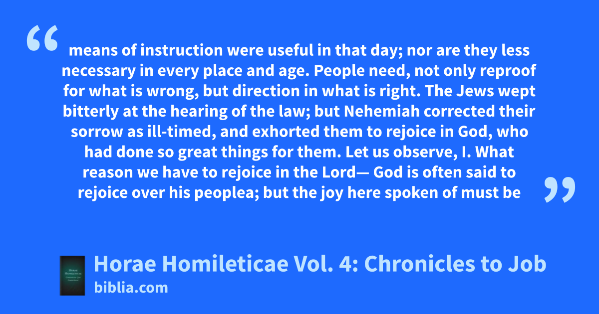 means of instruction were useful in that day; nor are they less necessary in every place and age. People need, not only reproof for what is wrong, but direction in what is right. The Jews wept bitterly at the hearing of the law; but Nehemiah corrected their sorrow as ill-timed, and exhorted them to rejoice in God, who had done so great things for them. Let us observe, I. What reason we have to rejoice in the Lord— God is often said to rejoice over his peoplea; but the joy here spoken of must be