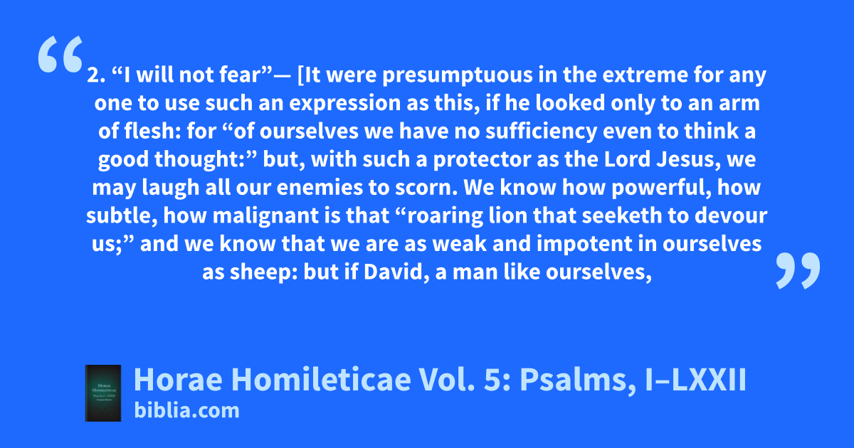 2. “I will not fear”— [It were presumptuous in the extreme for any one to use such an expression as this, if he looked only to an arm of flesh: for “of ourselves we have no sufficiency even to think a good thought:” but, with such a protector as the Lord Jesus, we may laugh all our enemies to scorn. We know how powerful, how subtle, how malignant is that “roaring lion that seeketh to devour us;” and we know that we are as weak and impotent in ourselves as sheep: but if David, a man like ourselves,