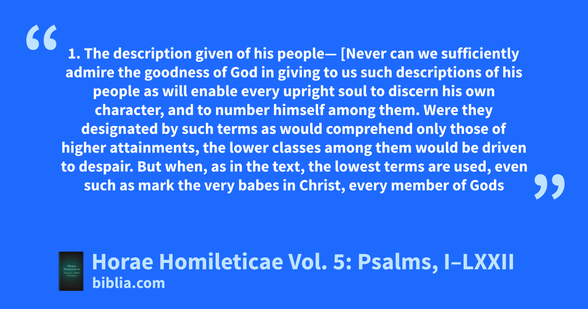1. The description given of his people— [Never can we sufficiently admire the goodness of God in giving to us such descriptions of his people as will enable every upright soul to discern his own character, and to number himself among them. Were they designated by such terms as would comprehend only those of higher attainments, the lower classes among them would be driven to despair. But when, as in the text, the lowest terms are used, even such as mark the very babes in Christ, every member of Gods