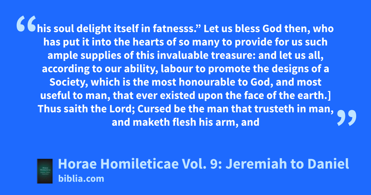 his soul delight itself in fatnesss.” Let us bless God then, who has put it into the hearts of so many to provide for us such ample supplies of this invaluable treasure: and let us all, according to our ability, labour to promote the designs of a Society, which is the most honourable to God, and most useful to man, that ever existed upon the face of the earth.] Thus saith the Lord; Cursed be the man that trusteth in man, and maketh flesh his arm, and