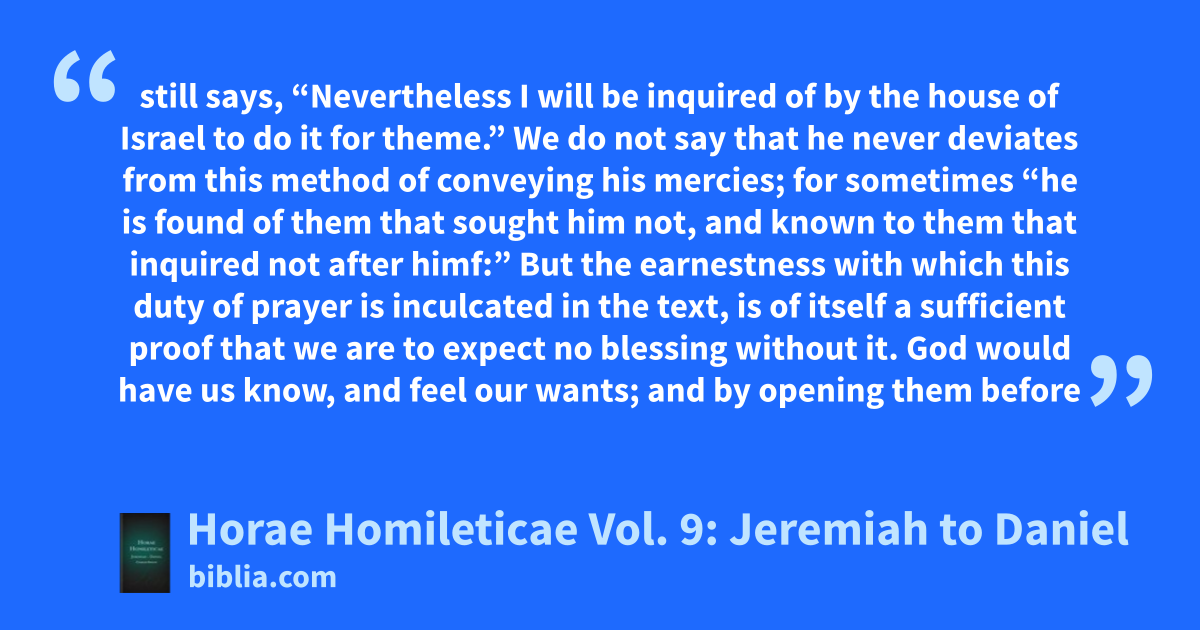 still says, “Nevertheless I will be inquired of by the house of Israel to do it for theme.” We do not say that he never deviates from this method of conveying his mercies; for sometimes “he is found of them that sought him not, and known to them that inquired not after himf:” But the earnestness with which this duty of prayer is inculcated in the text, is of itself a sufficient proof that we are to expect no blessing without it. God would have us know, and feel our wants; and by opening them before