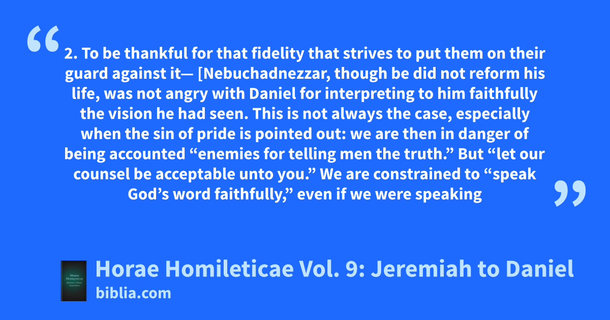 2. To be thankful for that fidelity that strives to put them on their guard against it— [Nebuchadnezzar, though be did not reform his life, was not angry with Daniel for interpreting to him faithfully the vision he had seen. This is not always the case, especially when the sin of pride is pointed out: we are then in danger of being accounted “enemies for telling men the truth.” But “let our counsel be acceptable unto you.” We are constrained to “speak God’s word faithfully,” even if we were speaking