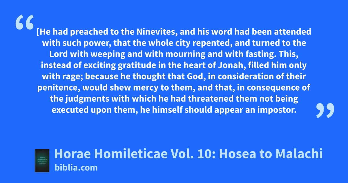 [He had preached to the Ninevites, and his word had been attended with such power, that the whole city repented, and turned to the Lord with weeping and with mourning and with fasting. This, instead of exciting gratitude in the heart of Jonah, filled him only with rage; because he thought that God, in consideration of their penitence, would shew mercy to them, and that, in consequence of the judgments with which he had threatened them not being executed upon them, he himself should appear an impostor.