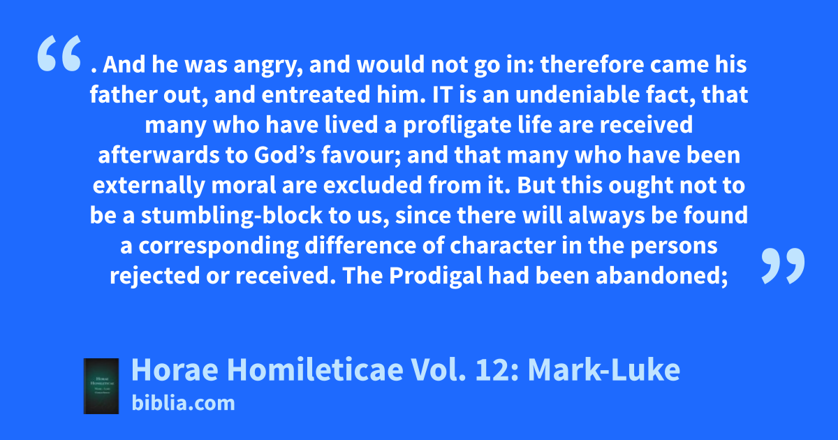 . And he was angry, and would not go in: therefore came his father out, and entreated him. IT is an undeniable fact, that many who have lived a profligate life are received afterwards to God’s favour; and that many who have been externally moral are excluded from it. But this ought not to be a stumbling-block to us, since there will always be found a corresponding difference of character in the persons rejected or received. The Prodigal had been abandoned;