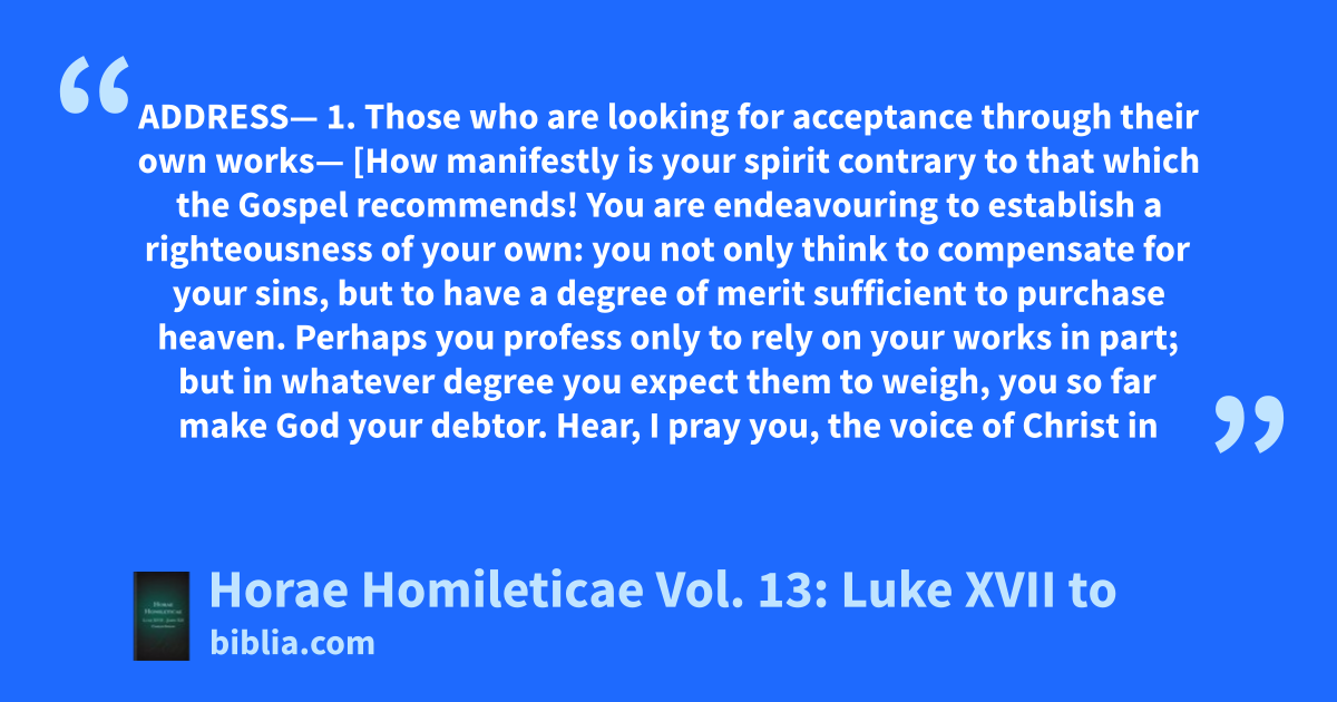 ADDRESS— 1. Those who are looking for acceptance through their own works— [How manifestly is your spirit contrary to that which the Gospel recommends! You are endeavouring to establish a righteousness of your own: you not only think to compensate for your sins, but to have a degree of merit sufficient to purchase heaven. Perhaps you profess only to rely on your works in part; but in whatever degree you expect them to weigh, you so far make God your debtor. Hear, I pray you, the voice of Christ in