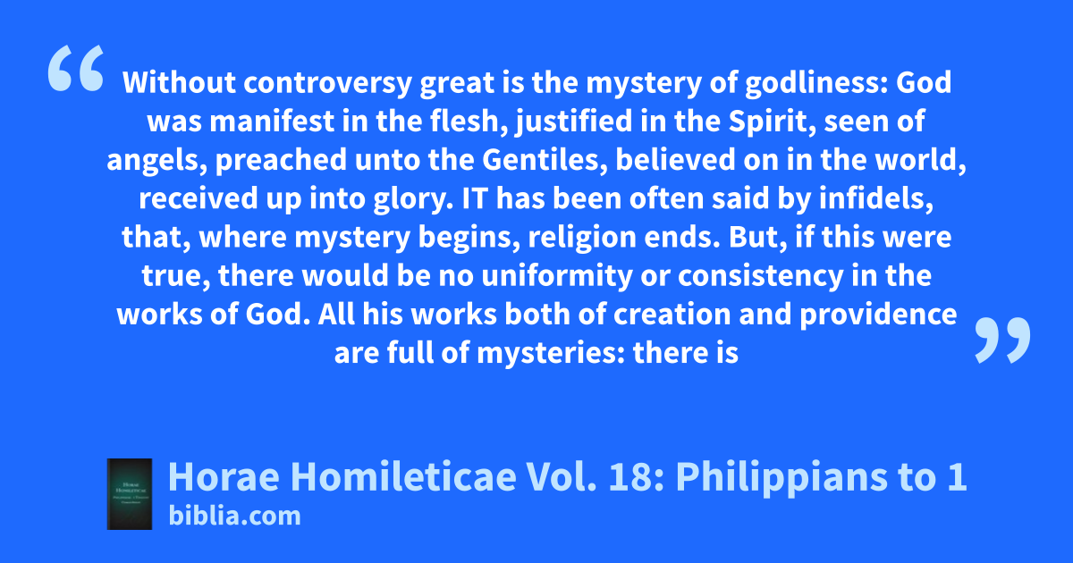 Without controversy great is the mystery of godliness: God was manifest in the flesh, justified in the Spirit, seen of angels, preached unto the Gentiles, believed on in the world, received up into glory. IT has been often said by infidels, that, where mystery begins, religion ends. But, if this were true, there would be no uniformity or consistency in the works of God. All his works both of creation and providence are full of mysteries: there is