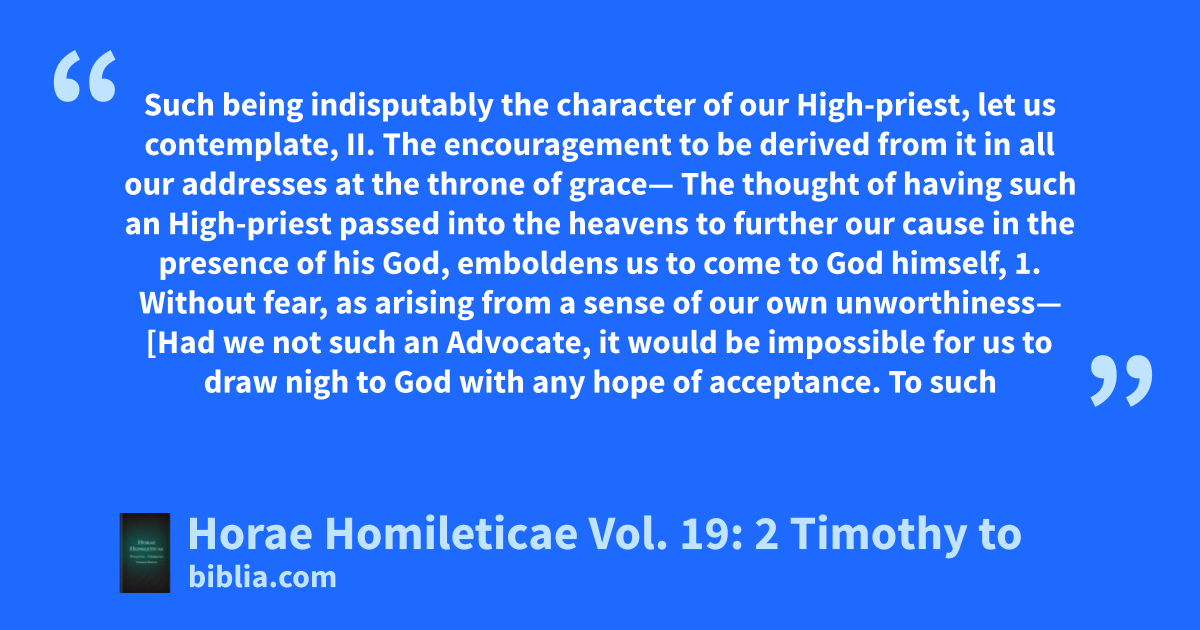 Such being indisputably the character of our High-priest, let us contemplate, II. The encouragement to be derived from it in all our addresses at the throne of grace— The thought of having such an High-priest passed into the heavens to further our cause in the presence of his God, emboldens us to come to God himself, 1. Without fear, as arising from a sense of our own unworthiness— [Had we not such an Advocate, it would be impossible for us to draw nigh to God with any hope of acceptance. To such
