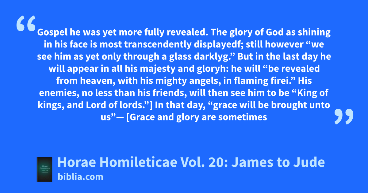 Gospel he was yet more fully revealed. The glory of God as shining in his face is most transcendently displayedf; still however “we see him as yet only through a glass darklyg.” But in the last day he will appear in all his majesty and gloryh: he will “be revealed from heaven, with his mighty angels, in flaming firei.” His enemies, no less than his friends, will then see him to be “King of kings, and Lord of lords.”] In that day, “grace will be brought unto us”— [Grace and glory are sometimes