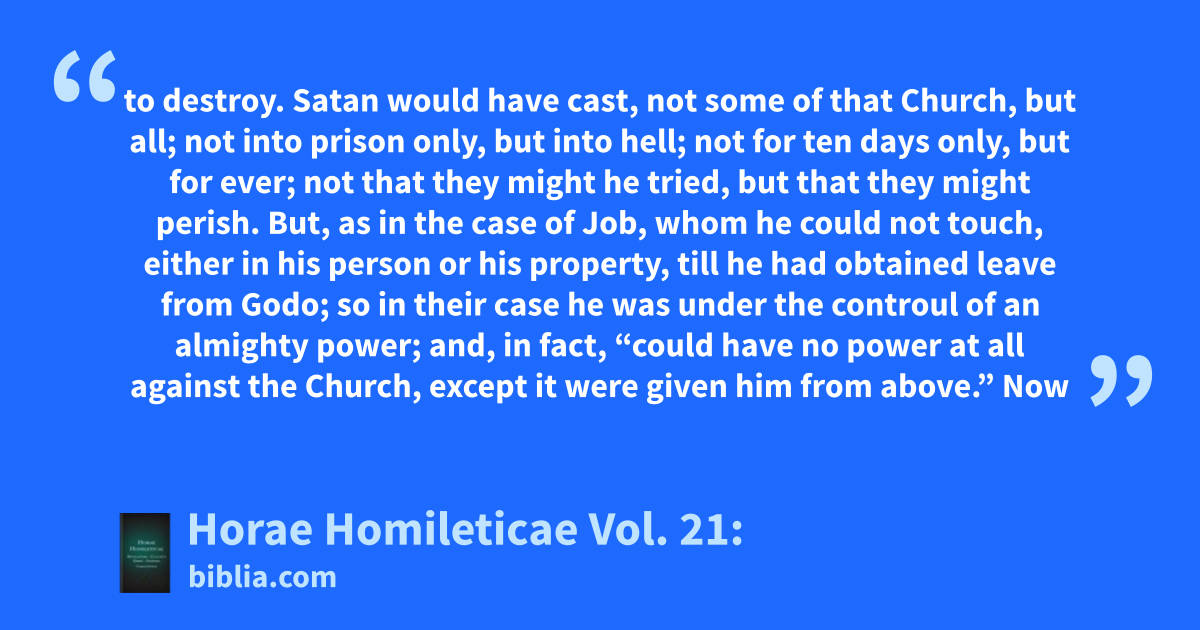 to destroy. Satan would have cast, not some of that Church, but all; not into prison only, but into hell; not for ten days only, but for ever; not that they might he tried, but that they might perish. But, as in the case of Job, whom he could not touch, either in his person or his property, till he had obtained leave from Godo; so in their case he was under the controul of an almighty power; and, in fact, “could have no power at all against the Church, except it were given him from above.” Now