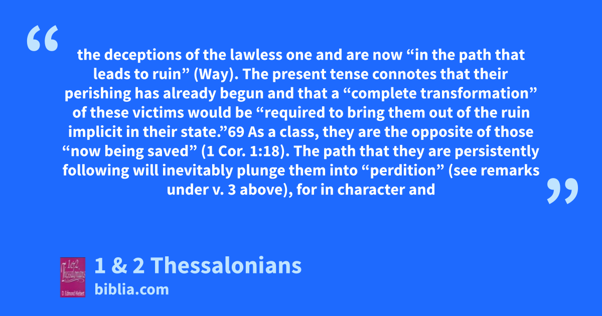 the deceptions of the lawless one and are now “in the path that leads to ruin” (Way). The present tense connotes that their perishing has already begun and that a “complete transformation” of these victims would be “required to bring them out of the ruin implicit in their state.”69 As a class, they are the opposite of those “now being saved” (1 Cor. 1:18). The path that they are persistently following will inevitably plunge them into “perdition” (see remarks under v. 3 above), for in character and