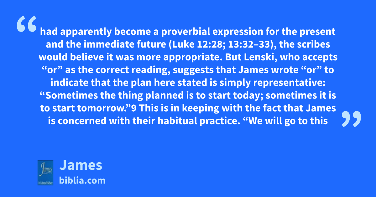 had apparently become a proverbial expression for the present and the immediate future (Luke 12:28; 13:32–33), the scribes would believe it was more appropriate. But Lenski, who accepts “or” as the correct reading, suggests that James wrote “or” to indicate that the plan here stated is simply representative: “Sometimes the thing planned is to start today; sometimes it is to start tomorrow.”9 This is in keeping with the fact that James is concerned with their habitual practice. “We will go to this