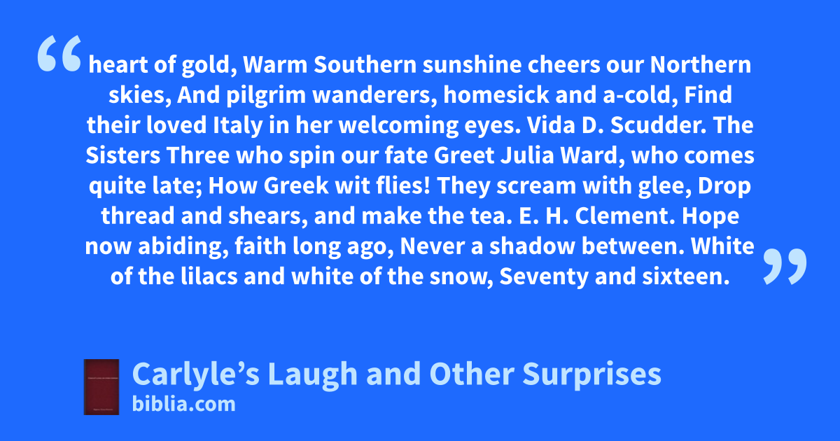 heart of gold, Warm Southern sunshine cheers our Northern skies, And pilgrim wanderers, homesick and a-cold, Find their loved Italy in her welcoming eyes. Vida D. Scudder. The Sisters Three who spin our fate Greet Julia Ward, who comes quite late; How Greek wit flies! They scream with glee, Drop thread and shears, and make the tea. E. H. Clement. Hope now abiding, faith long ago, Never a shadow between. White of the lilacs and white of the snow, Seventy and sixteen.
