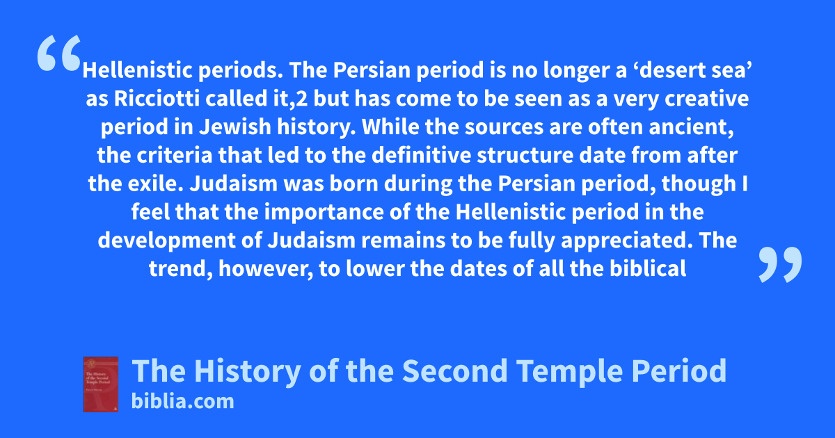 Hellenistic periods. The Persian period is no longer a ‘desert sea’ as Ricciotti called it,2 but has come to be seen as a very creative period in Jewish history. While the sources are often ancient, the criteria that led to the definitive structure date from after the exile. Judaism was born during the Persian period, though I feel that the importance of the Hellenistic period in the development of Judaism remains to be fully appreciated. The trend, however, to lower the dates of all the biblical