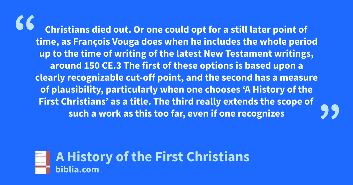 Christians died out. Or one could opt for a still later point of time, as François Vouga does when he includes the whole period up to the time of writing of the latest New Testament writings, around 150 CE.3 The first of these options is based upon a clearly recognizable cut-off point, and the second has a measure of plausibility, particularly when one chooses ‘A History of the First Christians’ as a title. The third really extends the scope of such a work as this too far, even if one recognizes