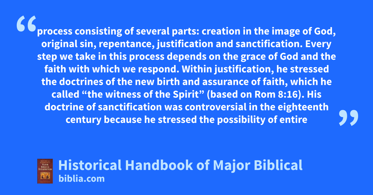 process consisting of several parts: creation in the image of God, original sin, repentance, justification and sanctification. Every step we take in this process depends on the grace of God and the faith with which we respond. Within justification, he stressed the doctrines of the new birth and assurance of faith, which he called “the witness of the Spirit” (based on Rom 8:16). His doctrine of sanctification was controversial in the eighteenth century because he stressed the possibility of entire