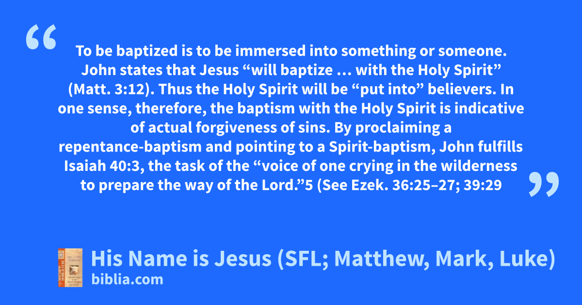 To be baptized is to be immersed into something or someone. John states that Jesus “will baptize … with the Holy Spirit” (Matt. 3:12). Thus the Holy Spirit will be “put into” believers. In one sense, therefore, the baptism with the Holy Spirit is indicative of actual forgiveness of sins. By proclaiming a repentance-baptism and pointing to a Spirit-baptism, John fulfills Isaiah 40:3, the task of the “voice of one crying in the wilderness to prepare the way of the Lord.”5 (See Ezek. 36:25–27; 39:29