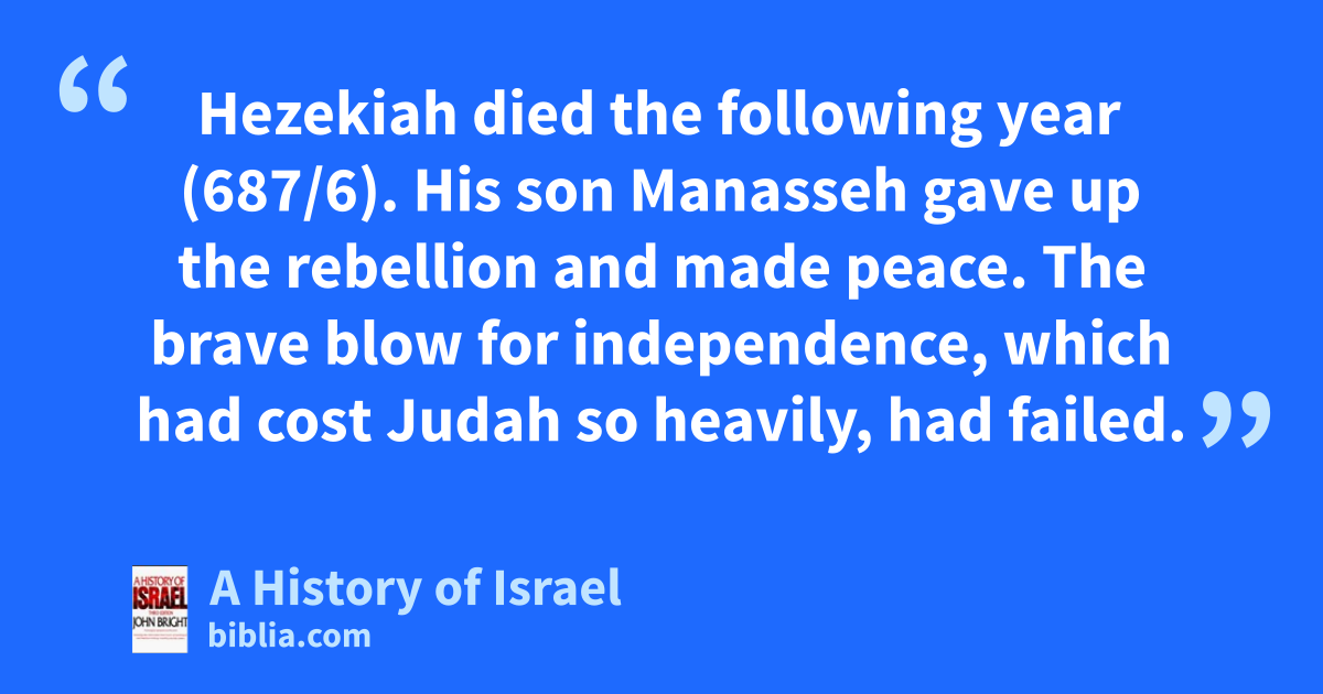 Hezekiah died the following year (687/6). His son Manasseh gave up the rebellion and made peace. The brave blow for independence, which had cost Judah so heavily, had failed.